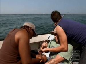 Even though the challenge called for traveling out to Montauk to catch fish, then picking up fruits and vegetables at the local farmer’s market, and then cooking on the beach, they returned to NYC that night, ostensibly to allow their fresh catch and produce to sit overnight, and then be tainted by the sand at Long Island City’s Water Taxi Beach the next night. Sure, it’s a gorgeous view of Manhattan (it occurred to us at that we’d be stupid not to visit the beach this summer), but it seemed silly not to just have an east-end cookout, especially after traveling all that way and getting their forearms so sore reeling in those striped bass (right, Dale?).