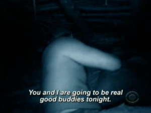 (We also want to note how the Redemption Island format has made the final eliminations completely anti-climactic (except for Russell’s, of course). And, in effect, it’s also made the results of Tribal Council somewhat insignificant. Kristina (and her boobs) leave for good and the emotional weight is diminished by the fact that her elimination comes midway through the episode, and the impact of the tribe speaking at the end of the show is undermined by the fact that the tribe has only partly spoken, that the person has not entirely been voted out of Survivor: Redemption Island. So in the end we feel kind of cheated, unfulfilled. And by this point we’re already looking forward to the end of Redemption Island Arena (oh, what’s that? It’s now the Chipotle Redemption Island Arena?) and a return to the traditional Survivor format.)