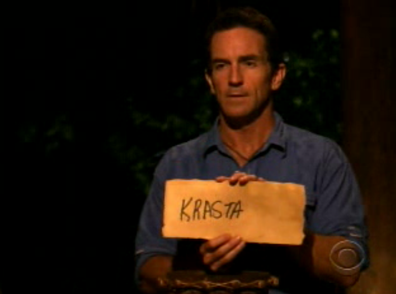 Vodpod videos no longer available.Not that Krista doesn’t make a case for herself to be voted out first, criticizing the tribe at Tribal Council for failing to play the game (and giving us our first “I’m not here to make friends“). Hello, Krista? That’s the benefit of winning every challenge. You keep the tribe strong and don’t have to over-strategize. As we pointed out last week, that’s how Tom Westman won it all in Palau. If anything, Krista failed to play the game, not saying a word for the first ten days, and then making little effort to scramble once she finally opened her mouth. In fact, instead of trying to build useful relationships, she just castigated and condescended her tribe members, and in doing so only put a bigger target on her back.