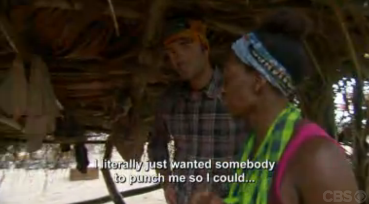 Unfortunately, though, Colton still has the Idol (thanks for that, Sabrina!), which means he remains King of the Misfits, garnering allegiance from Tarzan, Troyzan, Jonah, Leif, Little Mike, Fat Mike, Spanish Big, McMike, Greg Mike, Smelly Mike, Red Mike and, new member, Jay. But even though Colton is hell-bent on getting rid of Bill because he’s “wishy-washy” (read: Black), the rest of the “average Joes” push for Matt, who is not in that alliance, and who is not a Mike. Matt gets wind of the tide turning against him, so he corners Troyzan and starts going on about poultry again.